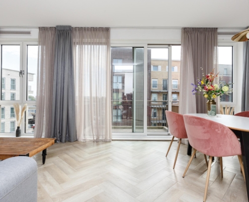 De royale woonkamer is voorzien van grote raampartijen met toegang tot het zonnige balkon. Er is in de woonkamer ruimte voor een gezellige zithoek en plek voor een eettafel.