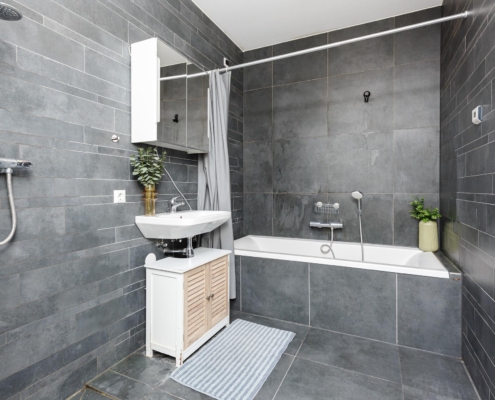 Inside the apartment, the bedrooms are located at the front. Both have a good size and are suitable for double beds. The hallway also provides access to a separate toilet. On the right side, you’ll find the meter cupboard and the cupboard housing the district heating unit. Moving to the left, there is the bathroom, modernly equipped with a shower, vanity unit, and a bathtub.