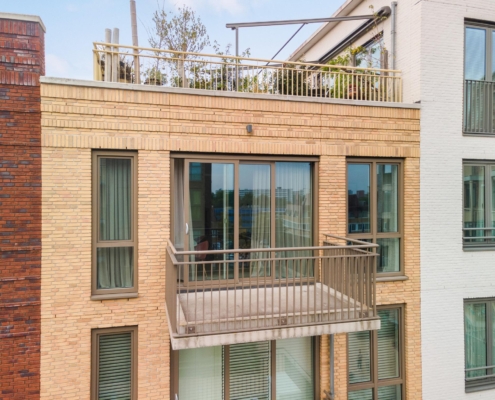 Gemeenschappelijke, afgesloten entree met toegang tot de fraai ontworpen binnentuin met speeltuintje en de lift naar de bovengelegen verdiepingen. Via de binnentuin kom je uit bij de lift die je naar het appartement of naar de beneden gelegen berging brengt.