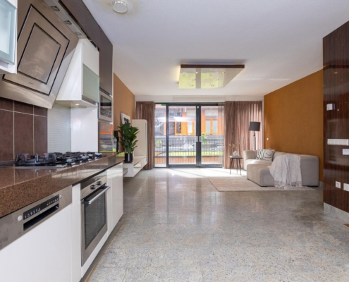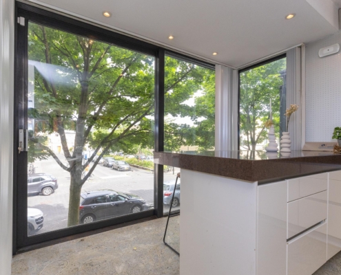 The first floor houses the living room and open kitchen, filled with natural light thanks to the large windows. At the rear, sliding doors open up to a balcony overlooking the garden – an ideal spot for a morning coffee. While the interior could use some updating, this floor holds great potential for creating a warm and inviting living space.