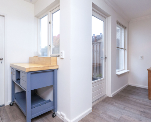 Achter de keuken ligt de betegelde bijkeuken: ideaal voor wasmachine, droger en extra opslag.