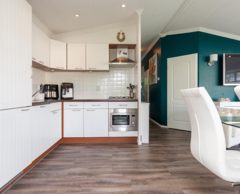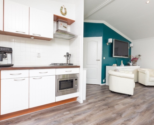 U loopt door de tuin naar de entree van de chalet. De woonkamer is lekker ruim en heeft grote raampartijen. De open keuken is voorzien van alle gemakken zoals een vaatwasser, grote koelkast en voldoende opbergruimte.