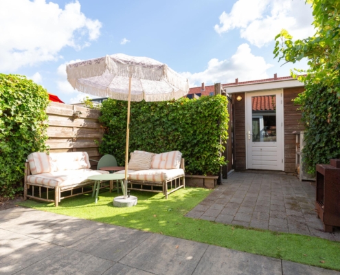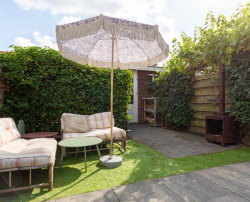 De besloten achtertuin ligt op het noordoosten en is voorzien van een achterom. De vrijstaande houten berging is ideaal voor het opbergen van tuingereedschap en fietsen, en is uitgerust met elektra. Via de tuin heeft u toegang tot uw eigen parkeerplaats.