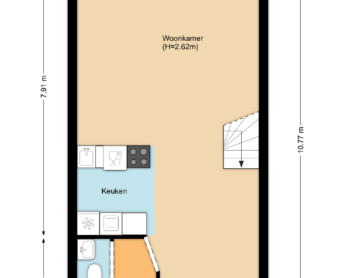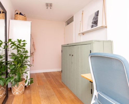 De uitgebouwde woonkamer is tuingericht en heeft lekker veel daglicht. Door de bio-ethanol haard wordt deze al sfeervolle ruimte nog mooier! Grote raampartijen en openslaande deuren naar de achtertuin laten het vele daglicht binnen. De houten vloer geeft de ruimte een warme en uitnodigende sfeer. De eetkamer aan de voorzijde biedt uitzicht op het groen en de speeltuin.