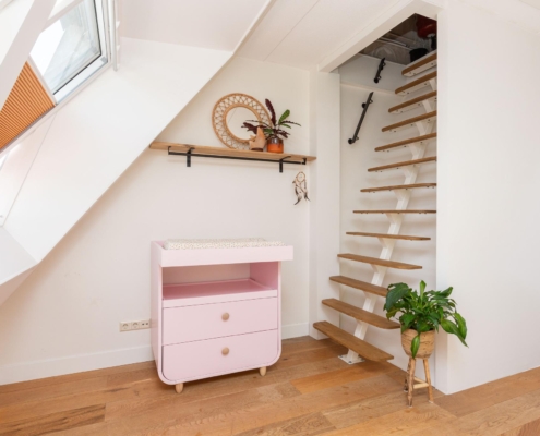 De tweede verdieping is momenteel in gebruik als hobbyruimte, maar biedt ook de mogelijkheid om een extra slaapkamer of kantoor te creëren en is bereikbaar via een vaste trap. Ook hier is veel daglicht door de twee Velux dakramen.